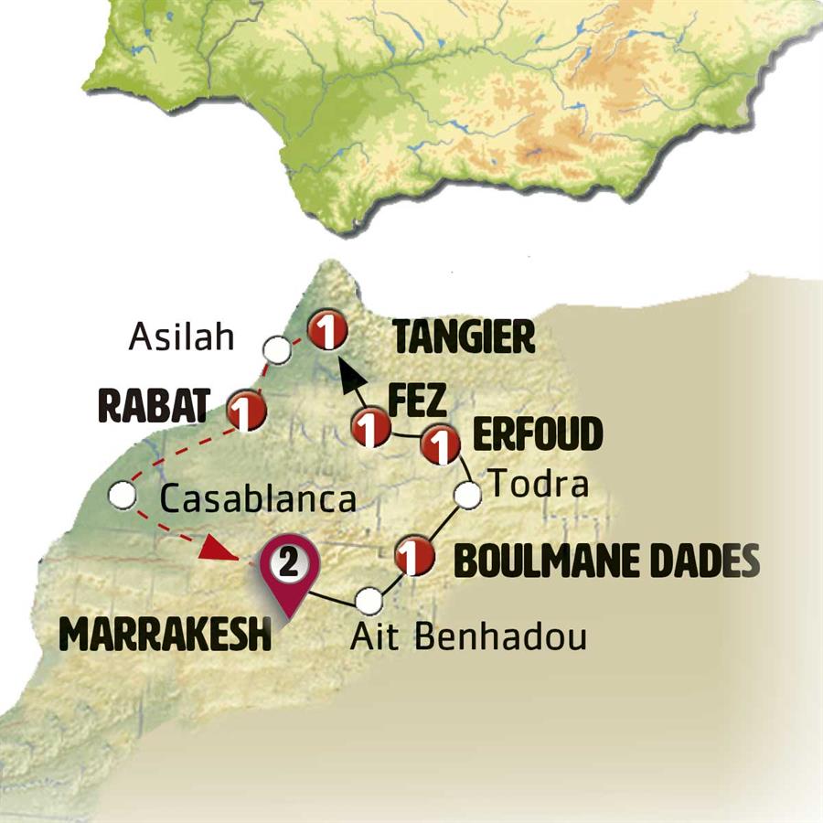 We’ll set out to cross the Atlas Mountains, where lofty peaks often covered in snow bid us farewell as we leave the palm groves of Marrakech. You’ll see small Berber villages clinging to the edges of deep gorges. Our journey includes a stop at the fortified village of Ait Benhaddou, renowned for its appearances in numerous movies. As we travel through landscapes reminiscent of biblical scenes, we´ll pause in Ouarzazate, known for its impressive Kasbah. Continuing through the Valley of Roses, we´ll reach Boumalne Dades where dinner will be included.