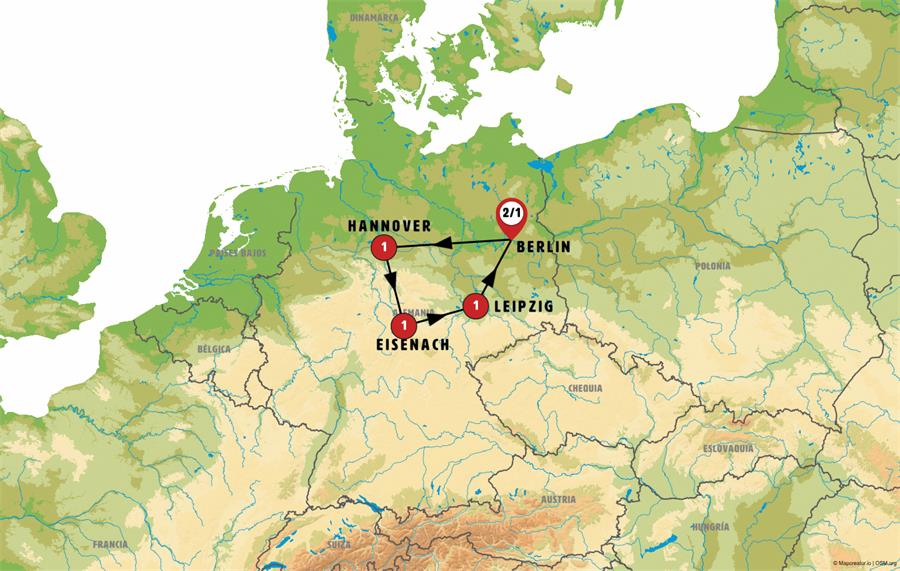 Our journey continues to GÖTTINGEN, an important university and scientific center where the Brothers Grimm once lived. We will have time for lunch and a stroll through its historic old town. In the afternoon, we head toward Thuringia, stopping in BAD SOODEN, a small and picturesque spa town nestled among mountains and beautifully preserved. Afterwards, we continue to EISENACH, a city with a splendid Baroque and Renaissance old town, home to the Bach House and Luther House. Dinner included.