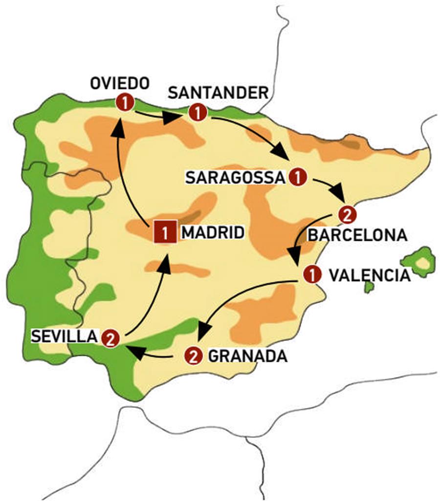 Note: If the number of travelers from Madrid to León is very limited, the trip might be carried out by train or regular transportation, missing the stop in Tordesillas.