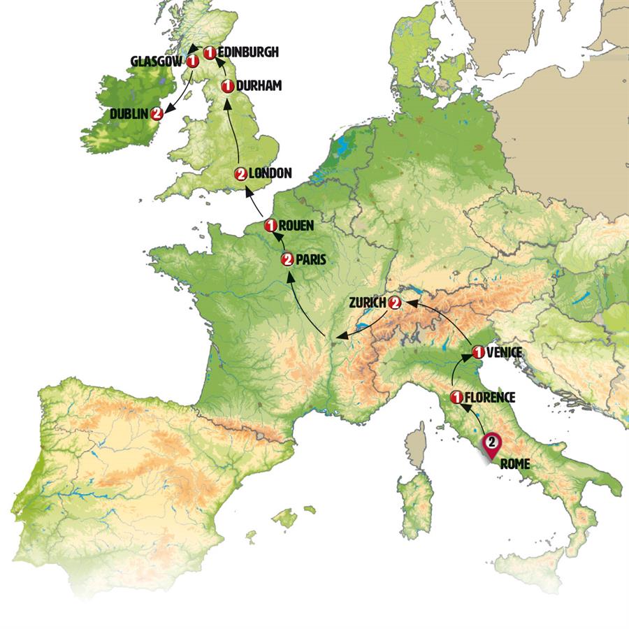 Today we’ll leave Glasgow and head towards southern Scotland to board a ferry in Cairnryan. Our journey will take us to Northern Ireland, arriving in Belfast, the capital of Northern Ireland, a monumental city that is emerging from its historical religious conflicts. We’ll then continue into Eire, Ireland, with our final stop in Dublin, arriving by the end of the day.