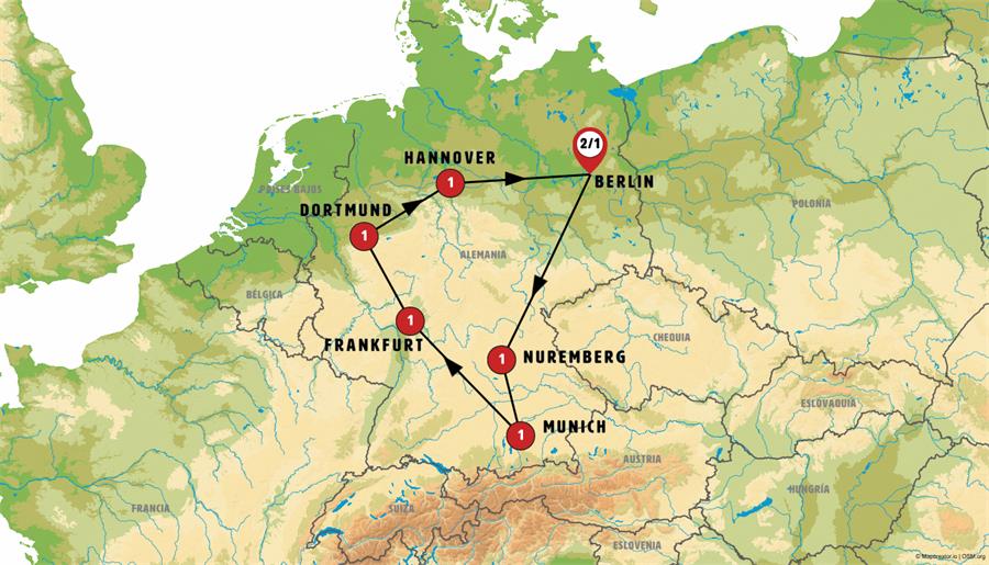 We’ll travel to Dresden, a city on the River Elbe, where you’ll be able to admire its stunning palace. Then, we’ll head to Bavaria, arriving in Bamberg, a lively and picturesque city—don’t miss Little Venice! Next, we’ll continue to Nuremberg, the second-largest city in Bavaria, renowned for its rich history. We suggest visiting the site where Hitler’s Coliseum once stood.