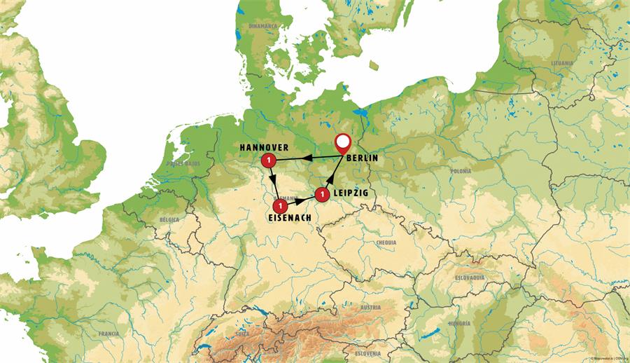 Our journey continues to GÖTTINGEN, an important university and scientific center where the Brothers Grimm once lived. We will have time for lunch and a stroll through its historic old town. In the afternoon, we head toward Thuringia, stopping in BAD SOODEN, a small and picturesque spa town nestled among mountains and beautifully preserved. Afterwards, we continue to EISENACH, a city with a splendid Baroque and Renaissance old town, home to the Bach House and Luther House. Dinner included.