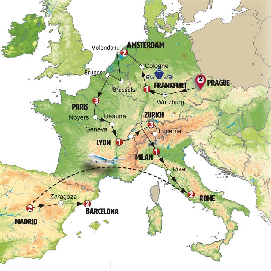 We’ll depart early from PRAGUE and stop in PILSEN, in western Bohemia, a city renowned for its beer. You’ll have time to stroll through its historic center, where you’ll find the Old Town Square, the cathedral, the Plague Column, and a Renaissance-era town hall. We’ll then cross into GERMANY and follow part of the Romantic Road. We’ll visit ROTHENBURG, a town that seems to come straight out of a fairy tale and is considered one of the most beautiful villages in the country. Afterward, we’ll head to FRANKFURT, the financial capital of Germany. After our arrival in the evening, enjoy free time in the historic city center, where you’ll find a wide variety of restaurants offering Indian, Asian, Italian, and international cuisines.