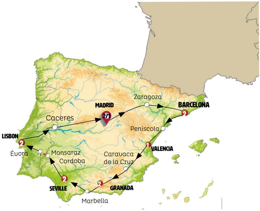 We’ll travel south along the Mediterranean, stopping in Peniscola, a charming medieval walled city surrounded by beautiful beaches, where you’ll have time for a stroll. We’ll continue to Valencia, arriving around lunchtime. In the afternoon, you’ll enjoy a tour with a local guide of this port city on the Levantine coast, with over 2000 years of history. The city’s urban layout is adorned with monuments from various eras, contrasting with the modern architecture of the City of Arts and Sciences. After the tour, you’ll have free time to explore at your leisure. A traditional local dinner will be included.