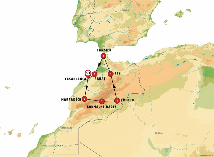 We’ll set out to cross the Atlas Mountains, where lofty peaks often covered in snow bid us farewell as we leave the palm groves of Marrakech. You’ll see small Berber villages clinging to the edges of deep gorges. Our journey includes a stop at the fortified village of Ait Benhaddou, renowned for its appearances in numerous movies. As we travel through landscapes reminiscent of biblical scenes, we´ll pause in Ouarzazate, known for its impressive Kasbah. Continuing through the Valley of Roses, we´ll reach Boumalne Dades where dinner will be included.