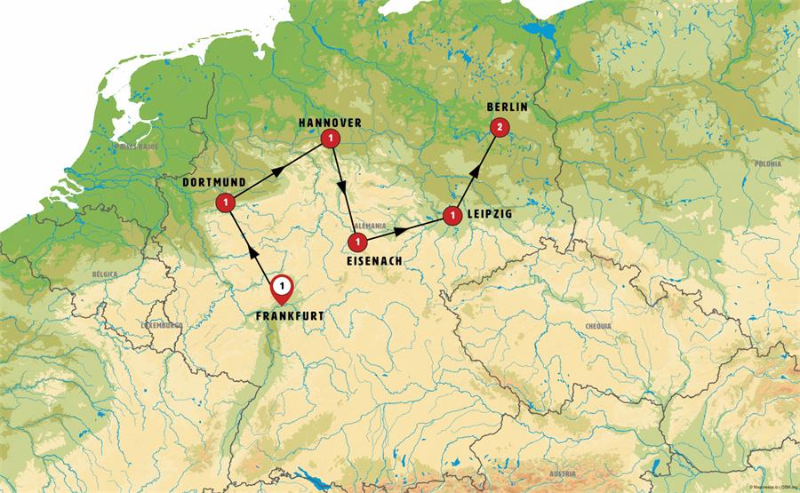 Our journey continues to GÖTTINGEN, an important university and scientific center where the Brothers Grimm once lived. We will have time for lunch and a stroll through its historic old town. In the afternoon, we head toward Thuringia, stopping in BAD SOODEN, a small and picturesque spa town nestled among mountains and beautifully preserved. Afterwards, we continue to EISENACH, a city with a splendid Baroque and Renaissance old town, home to the Bach House and Luther House. Dinner included.