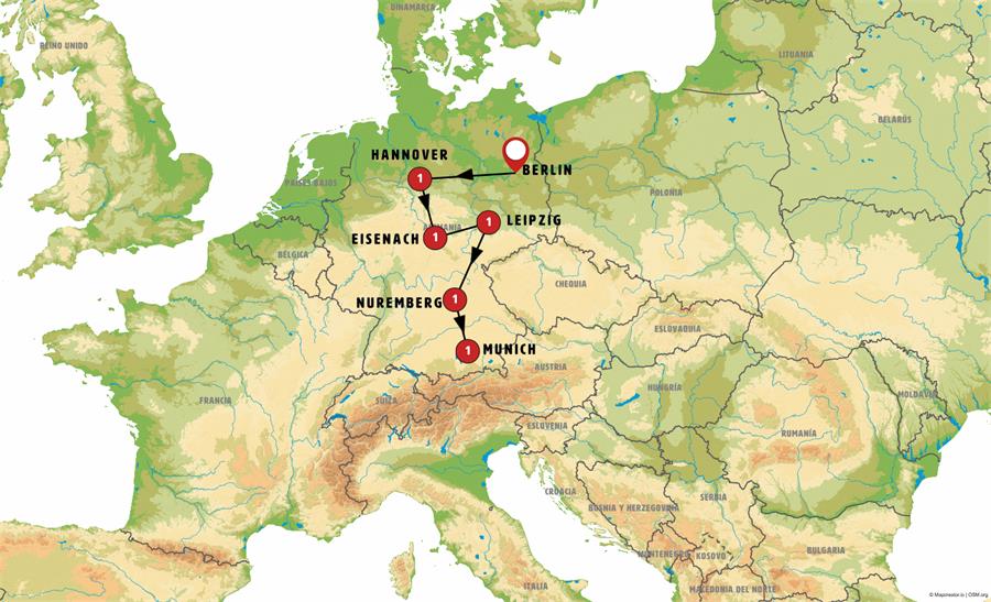 Our journey continues to GÖTTINGEN, an important university and scientific center where the Brothers Grimm once lived. We will have time for lunch and a stroll through its historic old town. In the afternoon, we head toward Thuringia, stopping in BAD SOODEN, a small and picturesque spa town nestled among mountains and beautifully preserved. Afterwards, we continue to EISENACH, a city with a splendid Baroque and Renaissance old town, home to the Bach House and Luther House. Dinner included.