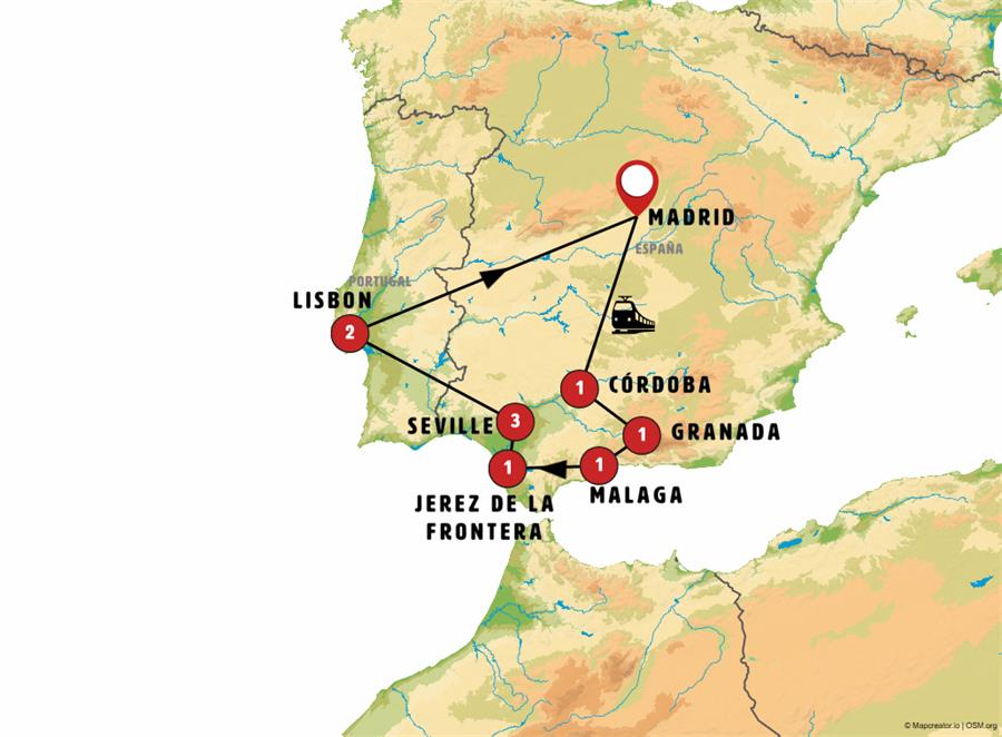 Our high-speed train will depart around 11:00 a.m. (time to be confirmed). In less than two hours, traveling at speeds of up to 300 km/h, we’ll arrive in Córdoba, the former capital of the Caliphate during the Islamic period. You’ll have free time to stroll through the city and enjoy lunch at your leisure. Later, we’ll meet our local guide for a visit to the city’s most iconic landmark, the stunning Mosque–Cathedral (tickets included), a true gem of both Islamic and Christian art. We’ll also wander through the charming Jewish Quarter, known for its narrow streets and flower-filled patios—true symbols of the city’s identity.