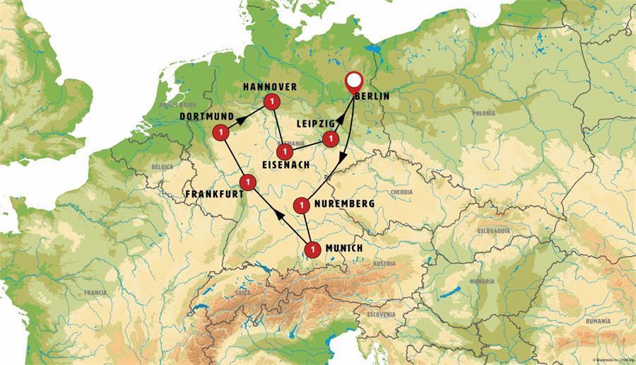We’ll travel to DRESDEN, a city on the River Elbe, where you’ll be able to admire its stunning palace. Then, we’ll head to Bavaria, arriving in BAMBERG, a lively and picturesque city—don’t miss Little Venice! Next, we’ll continue to NUREMBERG, the second-largest city in Bavaria, renowned for its rich history. We suggest visiting the site where Hitler’s Coliseum once stood.