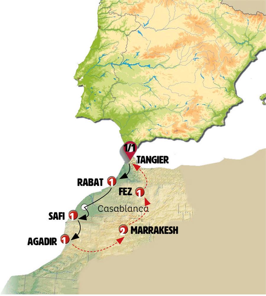 In the afternoon, we’ll journey north through Morocco on a modern highway, reaching Tangier by evening. Dinner will be included.