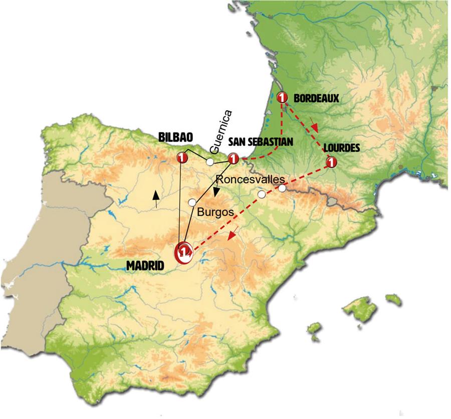 We’ll depart early from Lourdes, crossing the Pyrenees Mountains through stunning high-altitude landscapes. Upon entering Spain, we’ll stop for coffee in Sallent de Gállego, a historic mountain village known for its Gothic church and medieval stone bridge. Next, we’ll head to Huesca, where we can take a leisurely stroll through the historic center of this provincial capital. Highlights include the cathedral and the Abbey of San Pedro el Viejo, a 12th-century site with a beautiful Romanesque cloister. Our journey continues to Zaragoza, the vibrant capital of Aragon. Here, you’ll have time for lunch and to explore the historic quarter and the Plaza del Pilar, home to the Cathedral-Basilica of Our Lady of the Pillar, dedicated to the Blessed Virgin Mary. We’ll then continue to Madrid, arriving around 9:00 p.m.