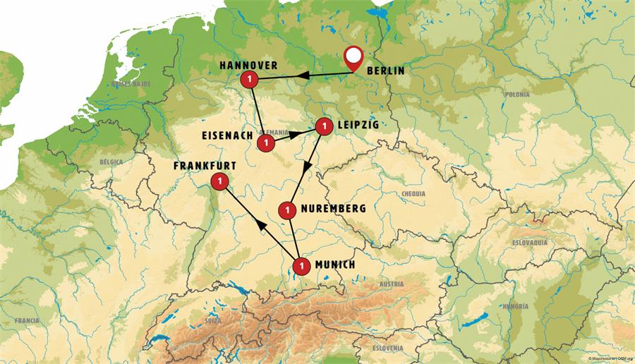 Our journey continues to GÖTTINGEN, an important university and scientific center where the Brothers Grimm once lived. We will have time for lunch and a stroll through its historic old town. In the afternoon, we head toward Thuringia, stopping in BAD SOODEN, a small and picturesque spa town nestled among mountains and beautifully preserved. Afterwards, we continue to EISENACH, a city with a splendid Baroque and Renaissance old town, home to the Bach House and Luther House. Dinner included.