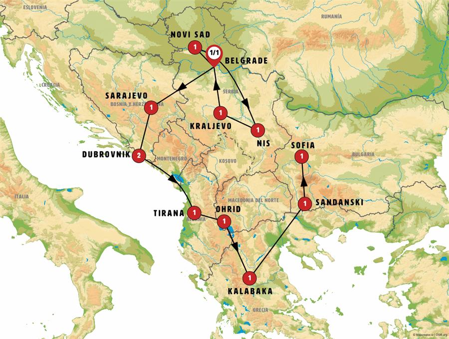We’ll journey south through Serbia, stopping first at the archaeological site of the Roman city of Viminacium (admission included). At its peak, the city was home to 40,000 inhabitants. Here, we’ll admire the Roman roads, as well as the remnants of ancient temples, streets, plazas, amphitheaters, palaces, hippodromes, and thermal baths. Our next stop will be the Manasija Monastery, one of the most important monuments of medieval Serbian culture. Surrounded by towering walls, the monastery’s church still preserves its 15th-century frescoes. We’ll continue to Nis, the third-largest city in Serbia, with a rich Roman heritage. This is where Constantine the Great was born. Overnight accommodation will be here.