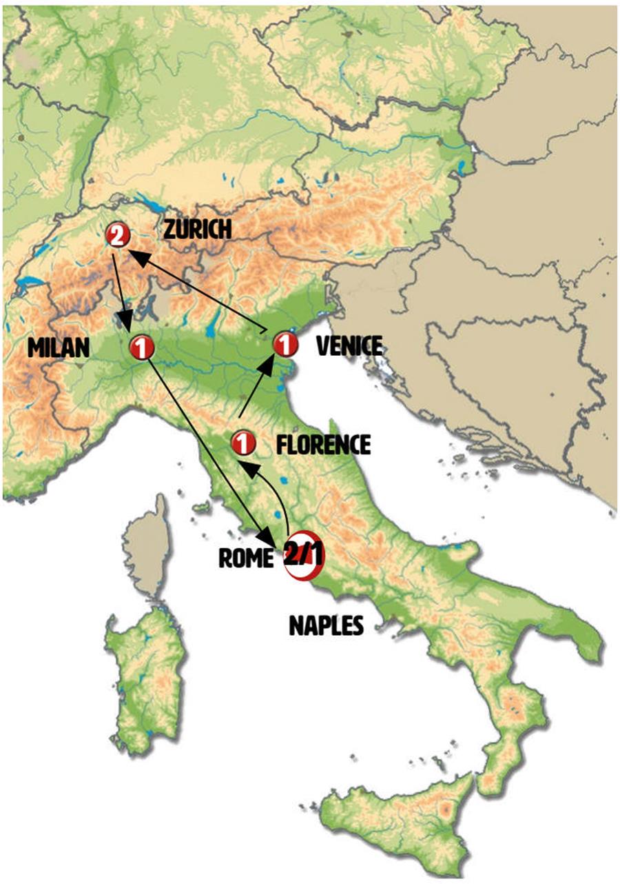 We’ll leave ZURICH early in the morning, crossing the Alps to reach the Italian-speaking part of Switzerland. Our first stop will be BELLINZONA, renowned for its three medieval castles, which are UNESCO World Heritage Sites. Perched on the hills overlooking the city, these castles highlight Bellinzona´s historical significance as a key alpine stronghold. Enjoy some free time to wander through the charming streets of the center. Next, we´ll enter Italy and stop in the charming town of COMO for lunch. This town is considered the jewel of LOMBARDY, known for its beautiful gardens beside the lake and its spectacular cathedral. We’ll continue to MILAN, where our guide will take us to the impressive Piazza del Duomo. You’ll have some time to wander around before we transfer you to the hotel.