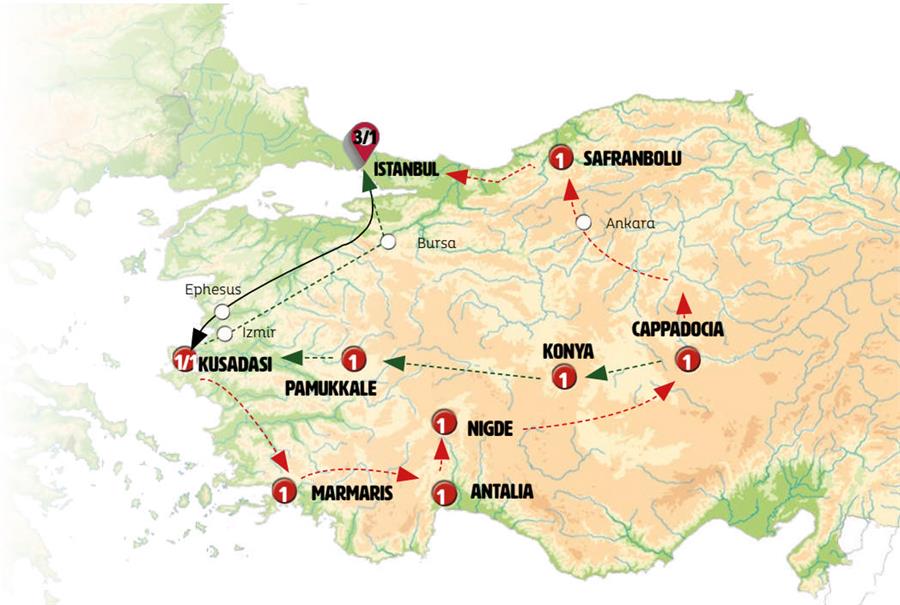 Note: During high season, from May through October, accommodations will be provided in Aydin instead of Kusadasi. In this case, after exploring Ephesus, we’ll make a stop in Kusadasi (4:30 p.m. to 7:00 p.m.), where we’ll include a panoramic tour of the city before continuing on to Aydin.