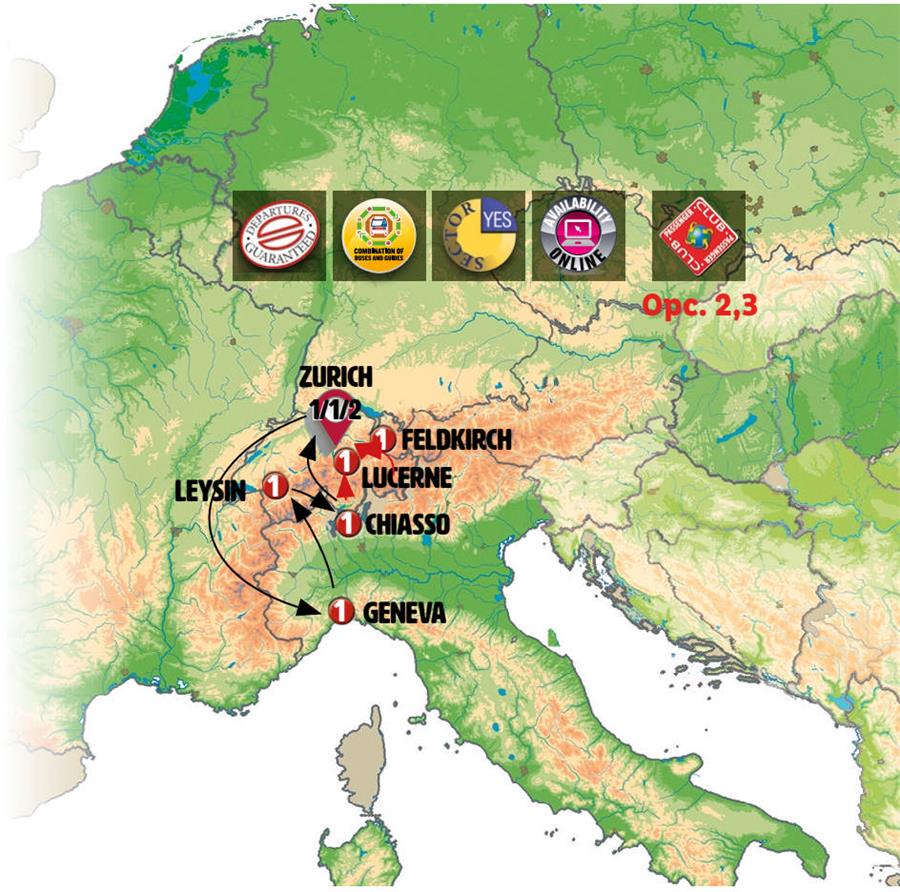 We’ll set off for the capital of the country, Bern, one of the most beautiful historic cities in Switzerland. We’ll go to the Rose Garden viewpoint to admire the beautiful landscape of the city, and you’ll have free time in the center. We’ll continue along a scenic road winding through stunning high mountain landscapes, passing charming villages with traditional wooden architecture and traveling through the Gstaad region, renowned for its ski resorts. We’ll include the cable car ride and lunch at Glacier 3000. From its terraces, you’ll enjoy breathtaking views and have the chance to walk across the suspension bridge that connects two peaks. After descending, we’ll journey toward Lake Geneva, an area known for its mild climate and extensive vineyards. We’ll visit Chillon Castle (tickets included), a medieval fortress built on the waters of the lake. Our journey will then take us through the heart of Montreux, an elegant town famous for its jazz festival, following the lake’s shoreline until we reach Geneva. Arrival will be at the end of the day.