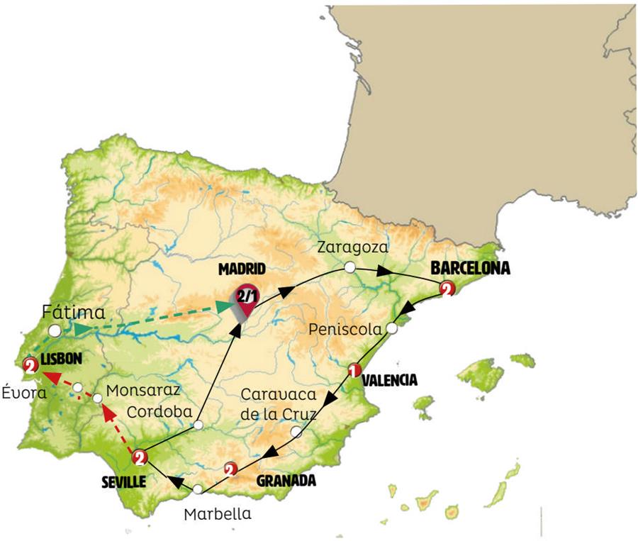 We’ll travel south along the Mediterranean, stopping in Peniscola, a charming medieval walled city surrounded by beautiful beaches, where you’ll have time for a stroll. We’ll continue to Valencia, arriving around lunchtime. In the afternoon, you’ll enjoy a tour with a local guide of this port city on the Levantine coast, with over 2000 years of history. The city’s urban layout is adorned with monuments from various eras, contrasting with the modern architecture of the City of Arts and Sciences. After the tour, you’ll have free time to explore at your leisure. A traditional local dinner will be included.