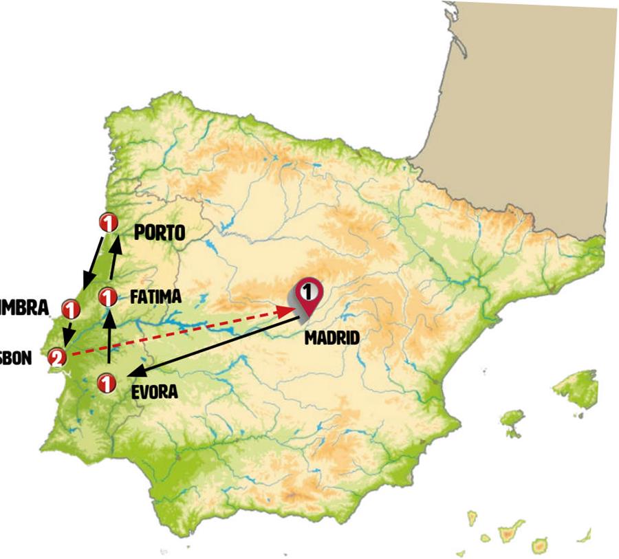 We’ll leave Madrid and journey to Mérida, the capital of Extremadura. Admission is included to the Archaeological Ensemble of Mérida, which features a Roman Theater and Amphitheater. This site is renowned for its excellent preservation and its designation as a World Heritage Site. We’ll enjoy lunch in the charming pedestrian historic center, filled with life and diverse restaurants. Our adventure will continue to Portugal, arriving in Évora, another city declared a World Heritage Site, renowned for its whitewashed streets, Renaissance palaces, and majestic cathedral. You’ll have free time to explore this enchanting city at your own pace. We recommend visiting the Chapel of Bones, built with 5000 skeletons!