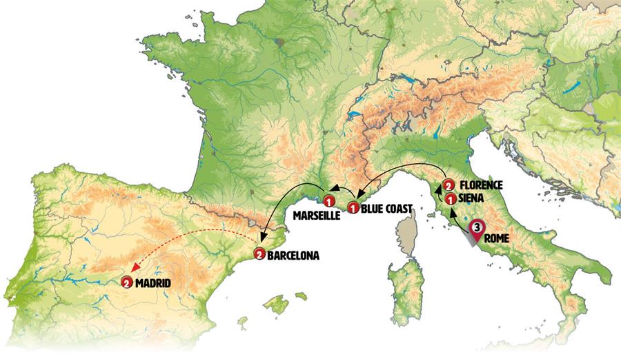 Departure from Florence to Pisa, with time to admire its artistic ensemble, including the famous Leaning Tower. The next stage offers extraordinary scenic beauty along the Italian Riviera. We´ll arrive in Sestri Levante, a charming small resort town by the sea. There will be time for lunch and a stroll. We will then continue towards the French Riviera, arriving in Monte Carlo in the mid-afternoon, where you can visit its historic casino. Our journey will proceed to Nice, with arrival around 08:00 p.m.