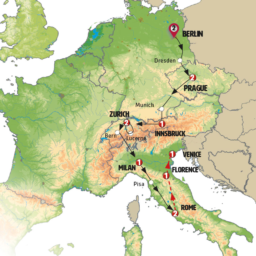 We’ll leave ZURICH early in the morning, crossing the Alps to reach the Italian-speaking part of Switzerland. Our first stop will be BELLINZONA, renowned for its three medieval castles, which are UNESCO World Heritage Sites. Perched on the hills overlooking the city, these castles highlight Bellinzona´s historical significance as a key alpine stronghold. Enjoy some free time to wander through the charming streets of the center. Next, we´ll enter Italy and stop in the charming town of COMO for lunch. This town is considered the jewel of LOMBARDY, known for its beautiful gardens beside the lake and its spectacular cathedral. We’ll continue to MILAN, where our guide will take us to the impressive Piazza del Duomo. You’ll have some time to wander around before we transfer you to the hotel.